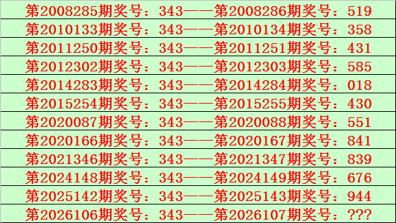 皇冠客服飞机:@seo3687排列三第2026106期开出奖号343,该号码历史上组选出现26次,前25次开出之后期下期奖号为:419、023、914、519、358、431、997、585、521、018、488、430、391、573、551、373、841、839、608、659、521、853、676、944、070,详见下表: