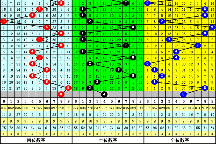 百位号码:第26102期-26106期奖号为:4-6-4-6-9,振幅为5点,分布较分散,本期看好百位走低,注意号码8。