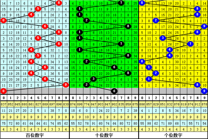 另外,两码合出现期数从高到低分别为:5、6开出10期,9开出9期,4、7开出8期,1、2、3开出5期,0、8开出4期,本期两码合参考:5、6、9。
